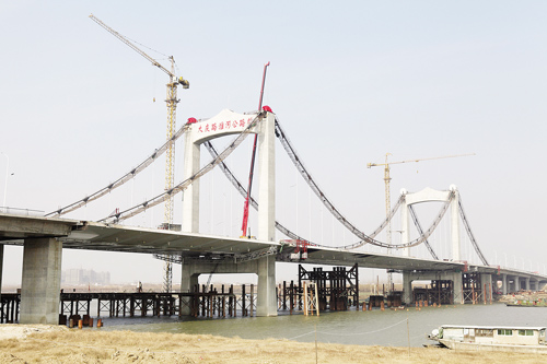 昨天上午,記者登上大慶路淮河公路橋主橋面時,熱鬧的施工現(xiàn)場與寒冷的天氣形成了鮮明的對比。大橋最南端的接線上,幾臺機(jī)器正在攤鋪?zhàn)詈笠粚訛r青。大慶路淮河公路橋建設(shè)指揮部技術(shù)質(zhì)量部部長薛峰告訴記者,橋面瀝青一天之內(nèi)就能鋪好。“瀝青是最后一道主要工序,完成后就標(biāo)志大橋主體大功告成了。”