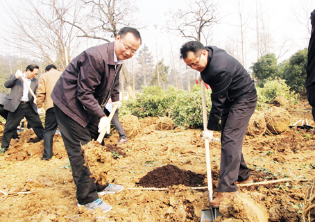上午10時許,一到植樹現(xiàn)場,周春雨、白金明、何金良、顧世平、方志宏等市幾大班子領導就迅速融入到植樹勞動的大軍之中。他們興致勃勃地拿起鐵鍬,同在場的干部一起揮鍬挖土,將一棵棵樹苗植入樹坑,培土,澆灌,每道工序都做得十分認真。市委書記周春雨、市長白金明一邊植樹,一邊與市林業(yè)局、住建委負責同志交談,了解全市植樹造林及“綠滿珠城”工作開展情況。經(jīng)過一番緊張勞動,300多棵桂花、櫻花等樹木昂然挺立,在和煦的春光中綻放蓬勃生機。