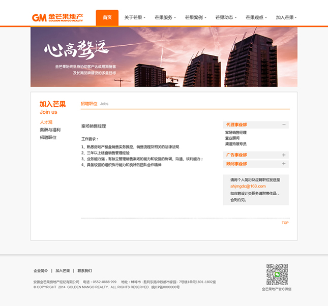 公司秉承“專業(yè)至上,服務(wù)至誠(chéng)”的經(jīng)營(yíng)理念,服務(wù)范疇涵蓋項(xiàng)目開發(fā)全程技術(shù)顧問、全程營(yíng)銷策劃及銷售代理等。作為專業(yè)的房地產(chǎn)經(jīng)紀(jì)服務(wù)機(jī)構(gòu),公司下設(shè)四部,即:顧問事業(yè)部、廣告事業(yè)部、代理事業(yè)部、二手房事業(yè)部。每個(gè)版塊既是獨(dú)立的運(yùn)作體系,集合起來又是一支多專業(yè)組合的精銳部隊(duì),統(tǒng)一的作戰(zhàn)部署,統(tǒng)一的行動(dòng)計(jì)劃,統(tǒng)一的戰(zhàn)略目標(biāo),堅(jiān)無不摧,戰(zhàn)無不勝!